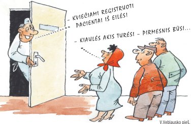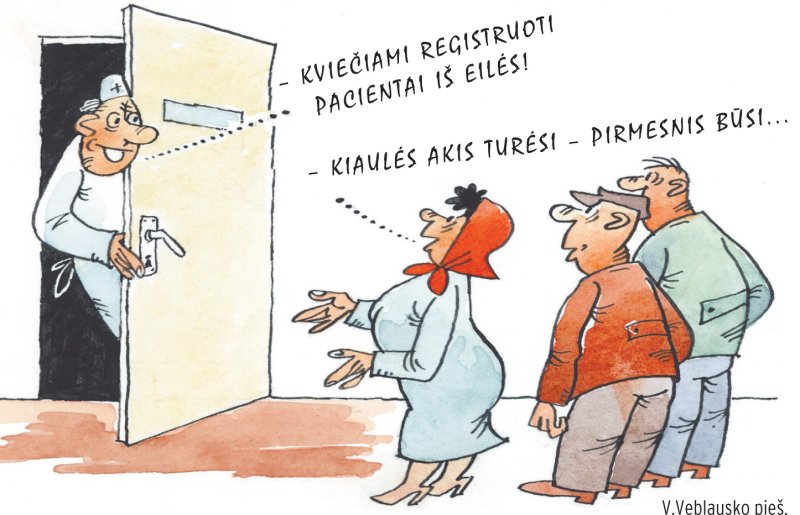Eilė kruta ne itin sparčiai. Kai porą kartų trinkteli atidaromos ir uždaromos kabineto durys, įeina ir išeina pacientai, trečiojo pagal eilę ponia nebeįleidžia, siekiantį rankenos tiesiog nustumia į šoną ir kabinetan įsispraudžia pati.