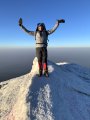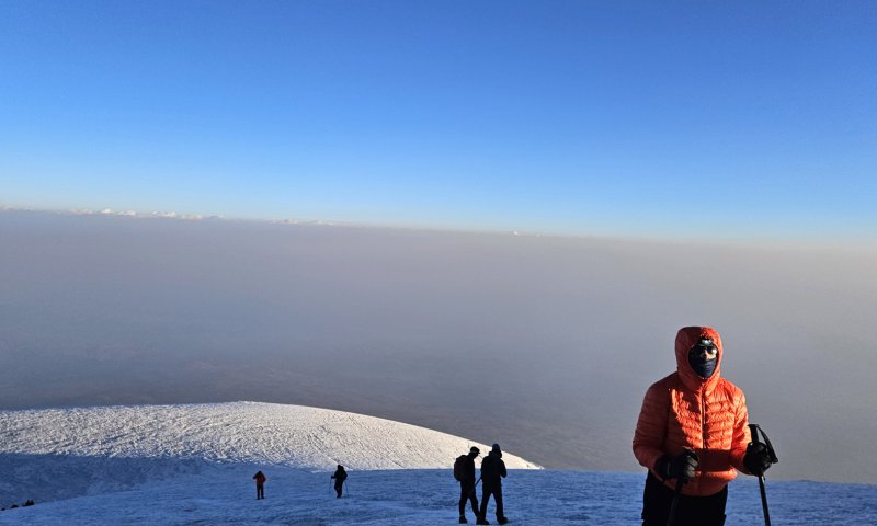 Viršūnės prieigose žengėme ant ledyno. Tuo metu visiems nebuvo lengva išsitraukti ir prisitvirtinti prie batų vadinamąsias „kates“. Rankų pirštai buvo sustirę, todėl dirželiai neklausė. Pradėjo švisti.