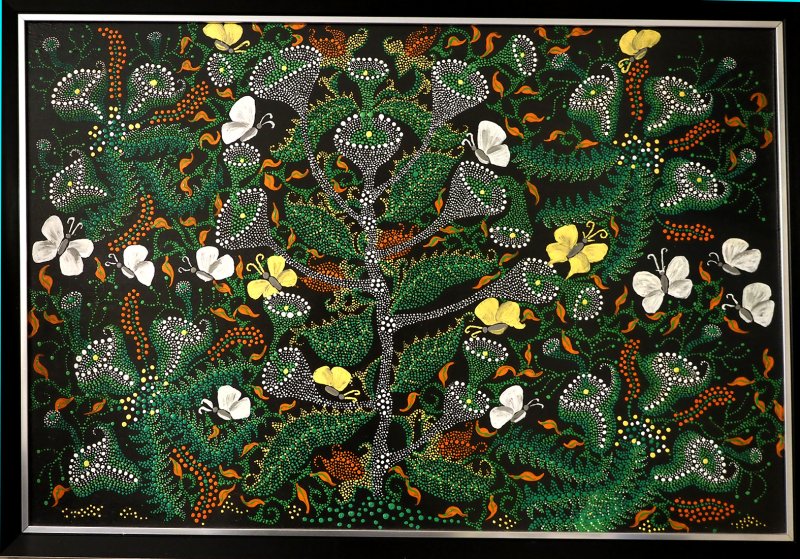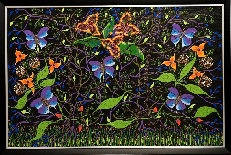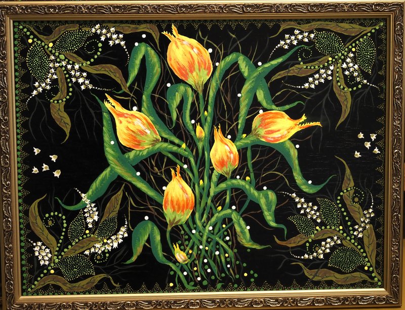 Iš tvarkingai surikiuotų paveikslų krūvos ištraukia pirmąjį kūrinį. Jame ilgakojai rožiniai flamingai ir keistai išsirangiusios oranžinės gėlės. Dekoratyvu ir tuo pačiu santūru, kompozicijoje ir spalvų parinkime nėra jokių trūkumų. Niekaip neįtartum, kad paveikslą nutaškavo pirmą kartą teptuką į rankas paėmęs žmogus.