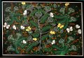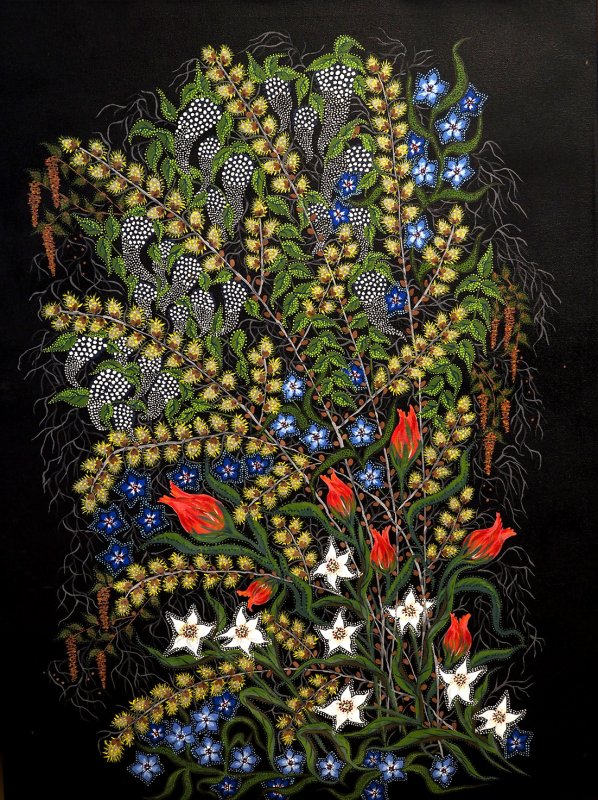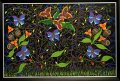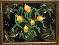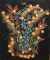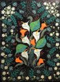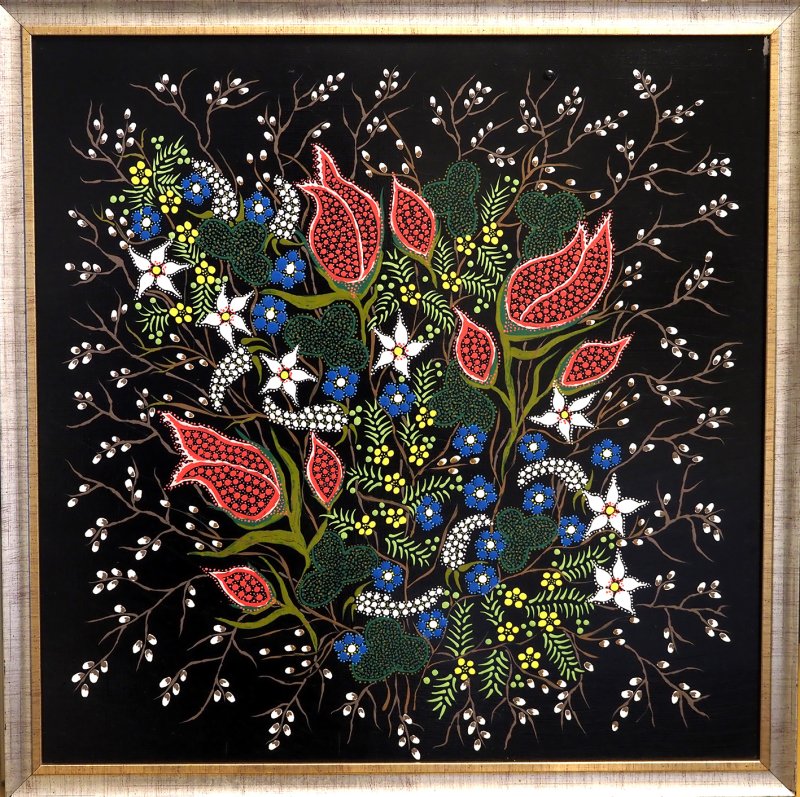 Juodame fone smulkiais taškučiais išpaišytos gėlės, paukščiai ir saviti augaliniai ornamentai – tai atpažįstamas dailininkės Stanislavos Volčenkienės stiliaus braižas.