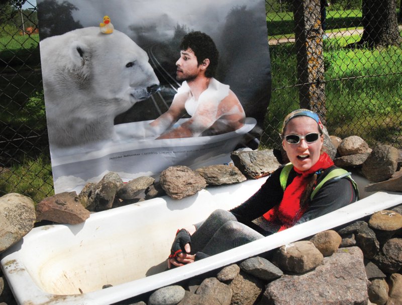 2. Akimirka iš 2012-ųjų „Nykštietiško triatlono“. Prie Anykščių kultūros sostinės simbolio – vonios – kultūros ambasadoriaus šokėjo Deivido Meškausko plakatas, jis pats buvo trasoje. Dalyviams buvo užduotis vonią surasti ir čia nusifotografuoti.