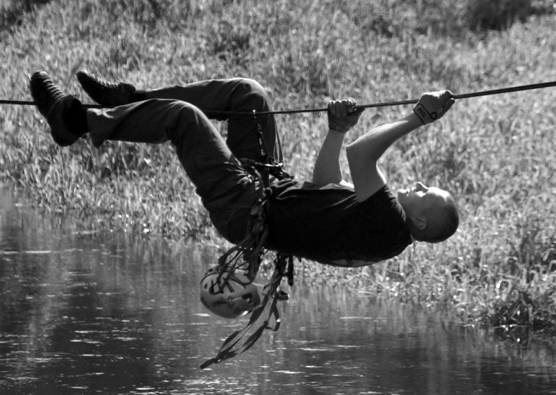 7. „Nykštietiško triatlono“ dalyviai keliasi per upę.