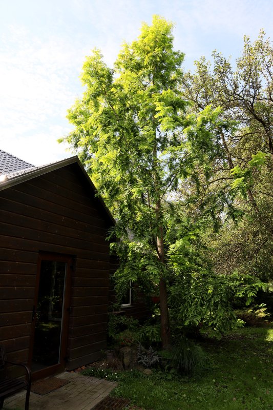 Prie pat namo, jį gerokai praaugusi, stiebiasi saulės nutvieksta, dėl to atrodanti salotinės spalvos, metasekvoja. Jos lapija panaši į vešlius miško paparčius.