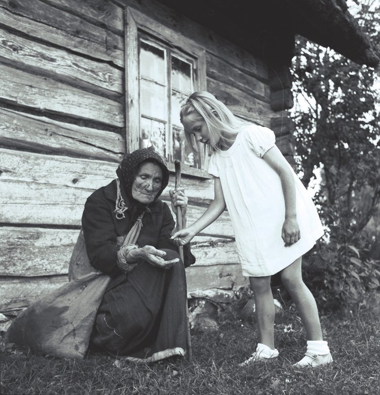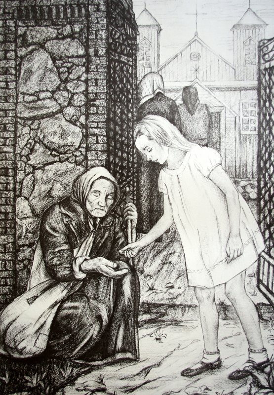 7. 8. Nuotraukos mizanscenoje – išmalda elgetai. Tą patį siužetą V.Šleivytė perkėlė į grafikos darbą, tik jau ne prie namų, o prie Antašavos bažnyčios.