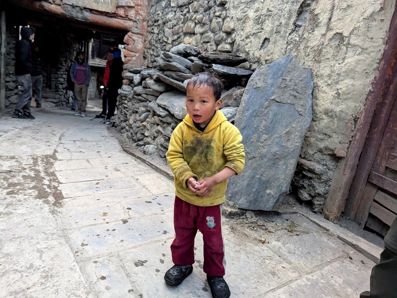 Šis Kagbeni kaimas mums pirmasis atšiaurioje kalnynų plyn-aukštėje, tad viskas įdomu. Čia jau laikomasi Tibeto tradicijų, nes jis, už netoliese esančios Kinijos sienos, visai netoli. Čia veikia ir garsus vienuolynas, o prie jo laksto vaikai, aprengti ilgais vienuolių drabužiais. Jie supranta, kad prieš svečius turi atrodyti rimti, bet vis tiek negali nesiausti per pertrauką tarp pamokų. Jie čia lanko mokyklą, tėvai juos atveža ilgam laikui, ne kiekvieną savaitgalį pasiima namo į dar nuošalesnius kaimus.