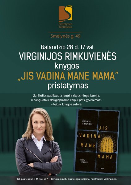 Balandžio 28 dieną, ketvirtadienį, 17 val. Panevėžio Elenos Mezginaitės viešosios bibliotekos padalinyje – Smėlynės bibliotekoje – įvyks rašytojos, žurnalistės Virginijos Rimkuvienės šiemet išleistos knygos „Jis vadina mane mama“ pristatymas.
