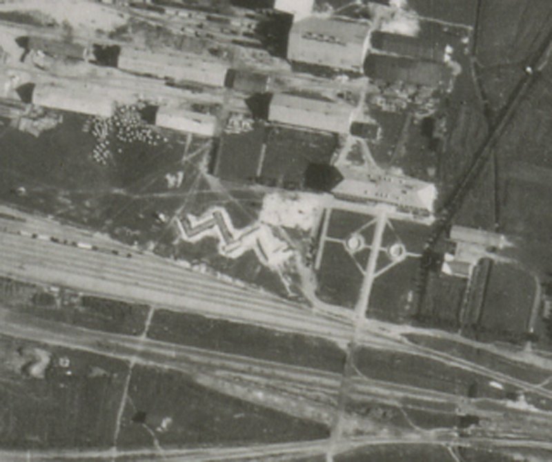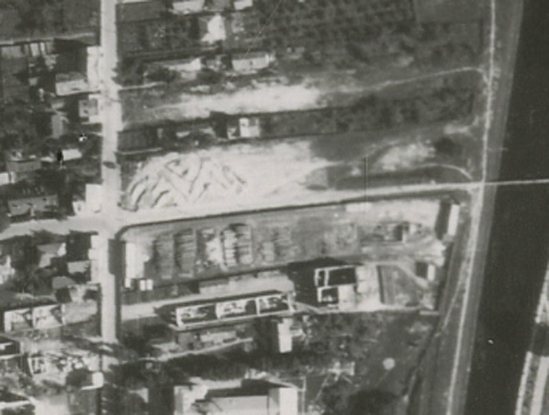 1. Slėptuvė šalia siaurojo geležinkelio depo. Panevėžys, 1944 m. aerofotografija.