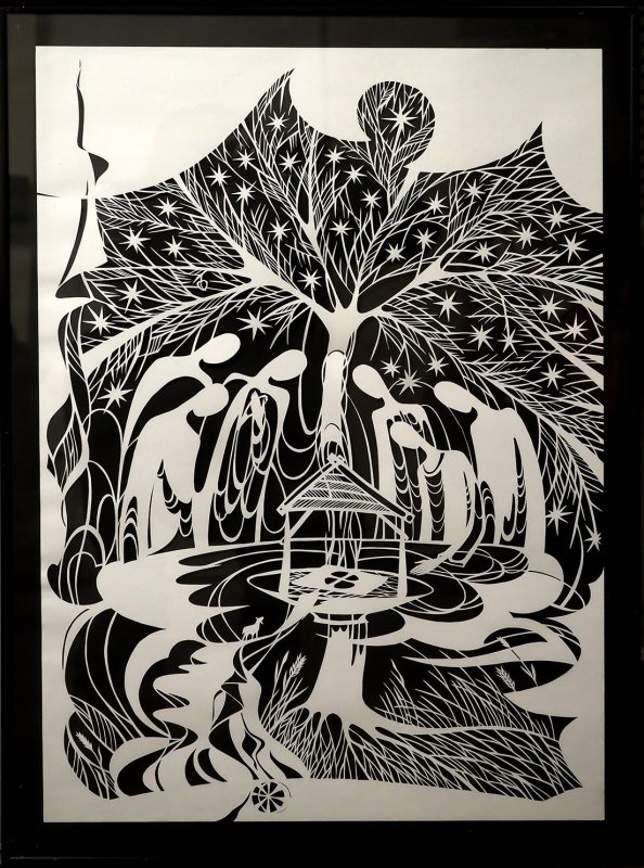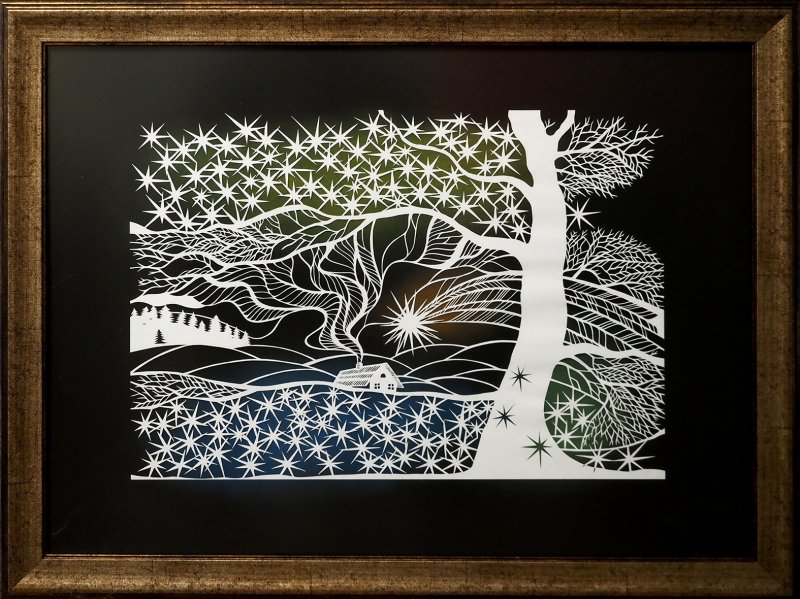 Kalėdos atsispindi ir visiškai kitokiame L.Stravinskienės karpinyje. Šiame jau nėra žmonių ir angelų, o jo centre – namas tarp kalnelių, šalia didžiulio trimis žvaigždėmis padabinto baltakamienio medžio, galbūt ąžuolo, ir miško netoliese.