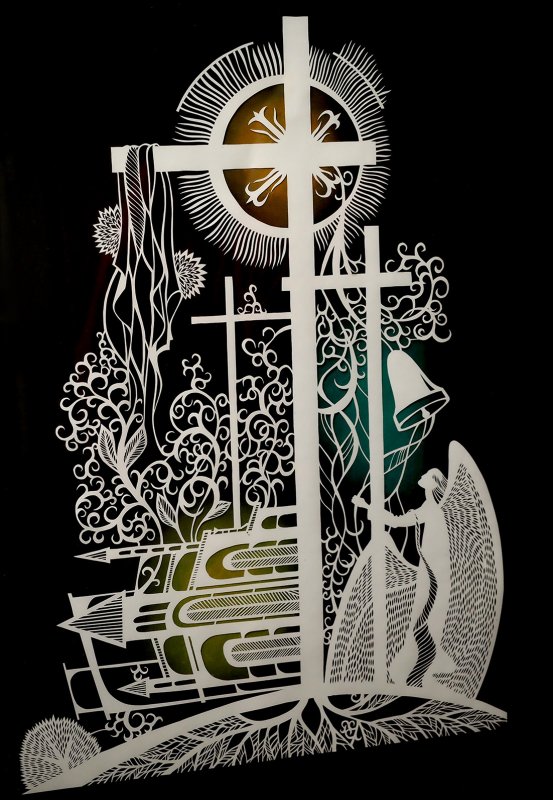 Dar paslaptingesnis L.Stravinskienės karpinys, kuriame vaizduojami trys kryžiai. Didžiausias papuoštas liaudišku motyvu – saulute ir tarsi medis leidžiantis šaknis į žemę.