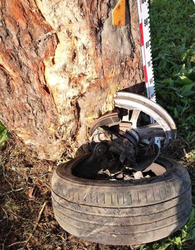Iš važiuoklės išplėštas ratas įstrigo medyje.