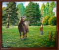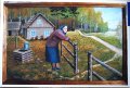 „Mano tėviškė Zyboliai, prie Moškėnų piliakalnio. Va, čia savas kaimas, kai pavasarį pirmąkart išleidžiam gyvulius pasiganyt, avelė, ėriukai, arklys ir gryčiukė ant kalniuko“, – rodo į saulėtą vaizdą, nutapytą iš atminties.