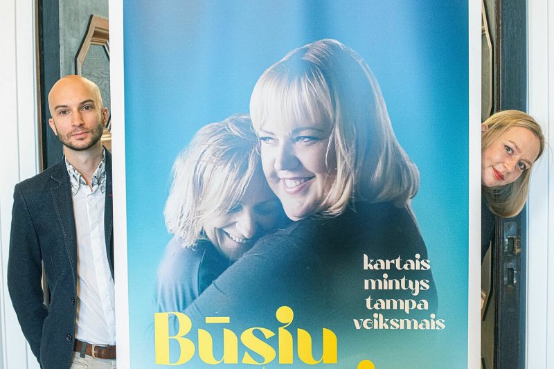 „Būsiu su tavim“ režisieriai Maximilien Dejoie ir Virginija Vareikytė prie filmo plakato. LRT nuotr.