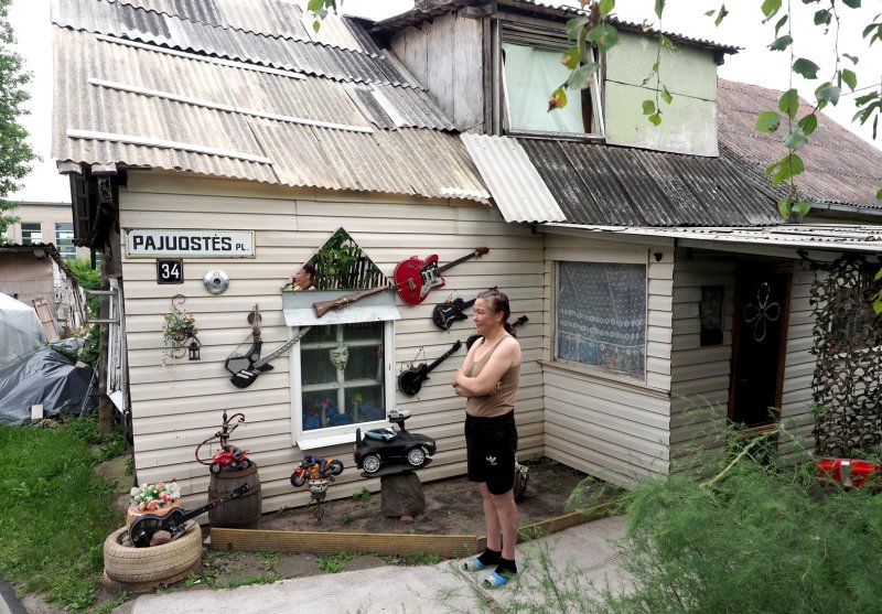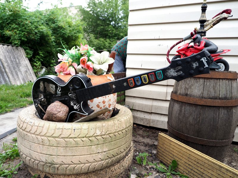 Ant į gatvę atsuktos sienos prikabinėta tikrų ir dekoratyvinių gitarų, virš lango įtaisyta trikampė veidrodinė „akis“, o po langais, kur turėtų būti darželis, ant kelmų ar akmenų išdėliotos vaikiškos mašinos ir motociklai.