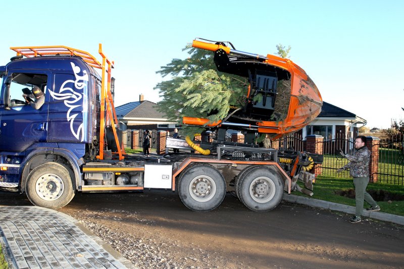 Didelių medžių persodinimo įrenginys buvo sumontuotas ant įprasto vilkiko.