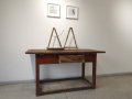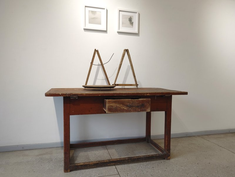 Virš stalo dvi ramių peizažų nuotraukos, anot menininko, niekaip su niekuo nesisieja ir nieko neiliustruoja. Žiūrovai kalbasi, kad visgi iliustruoja. Tylą.