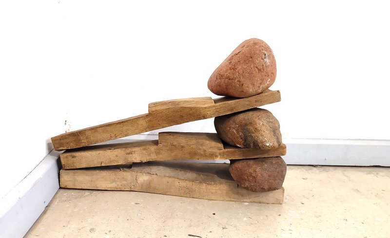 Paklaustas, ką vaizduoja kampan įspraustos trys lentelės, perskirtos akmenimis, autorius šypsojosi ir sakė, kad tai – tik ritmas.