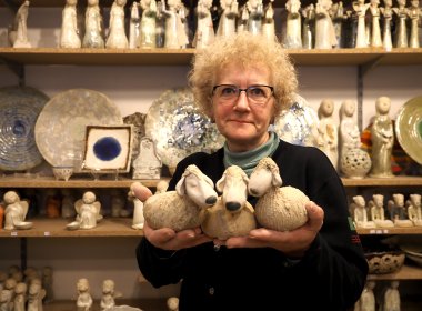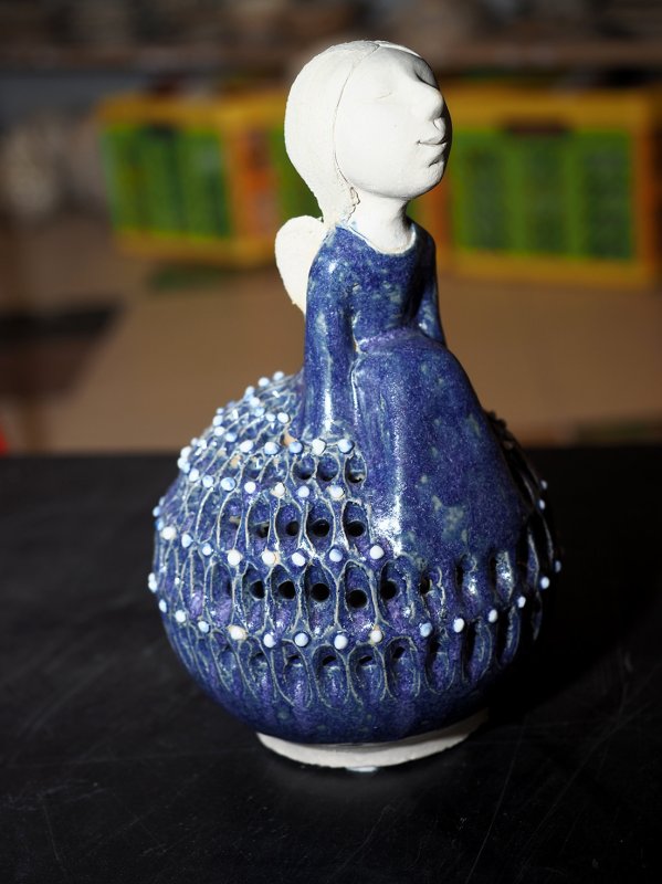 Panevėžietės keramikės Birutės Verbickaitės karalystėje tvyro ypatinga atmosfera. Čia kojas nukorę sėdi dangiškos ramybės pilni angelai, laikrodžio rodyklės bėga per laukų žolynus, lėkštėje vėjo gūsis suka klevo lapus, o žiūrėdamas į stiklinį dugną matai vandens gelmę.