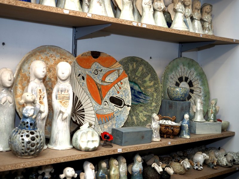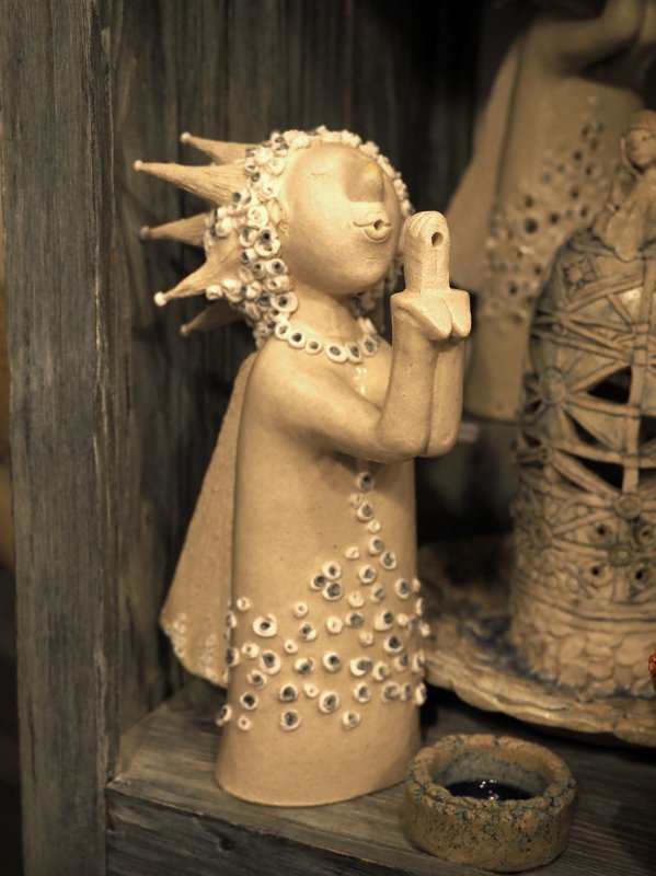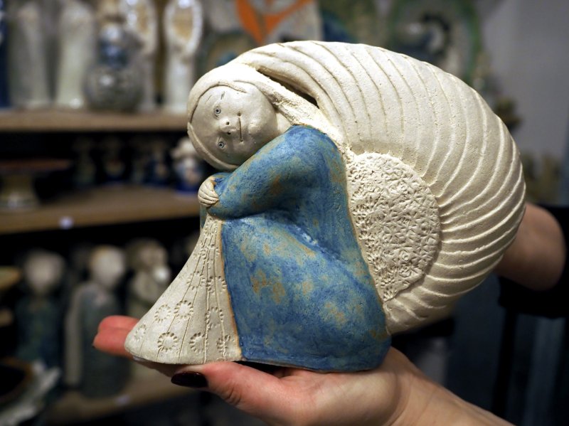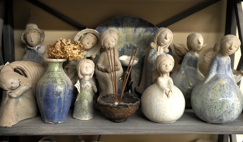 Ant lentynų kojas nukorusios sėdi sparnuotosios būtybės, kitos šypsosi stovėdamos. Kiekvienas angeliško veido šamotinis angelas vis kitoks, bet visi – su gėrio išraiška.