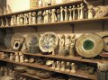 Ant sienos kabo eilė šamotinių laikrodžių, jų ciferblatuose matomi gamtos vaizdai.