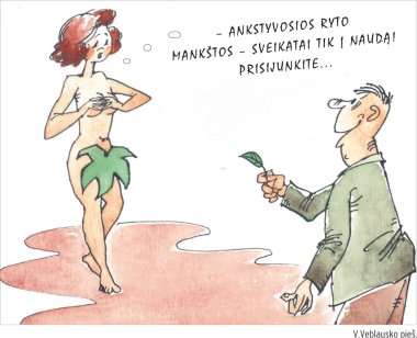 Bandėm su sveikuole gražiuoju susitarti, kad ji vandens procedūras ir mankštas darytų namo viduj – pusė gatvės neprikeltų. Toji tik juokėsi, esą jos pukšėjimai ir aikčiojimai yra natūralūs gamtos garsai, panašiai kaip paukštelių giesmės. O keltis su saule esą sveika – anksčiau gult eisim, prie televizorių nekabosim.