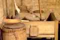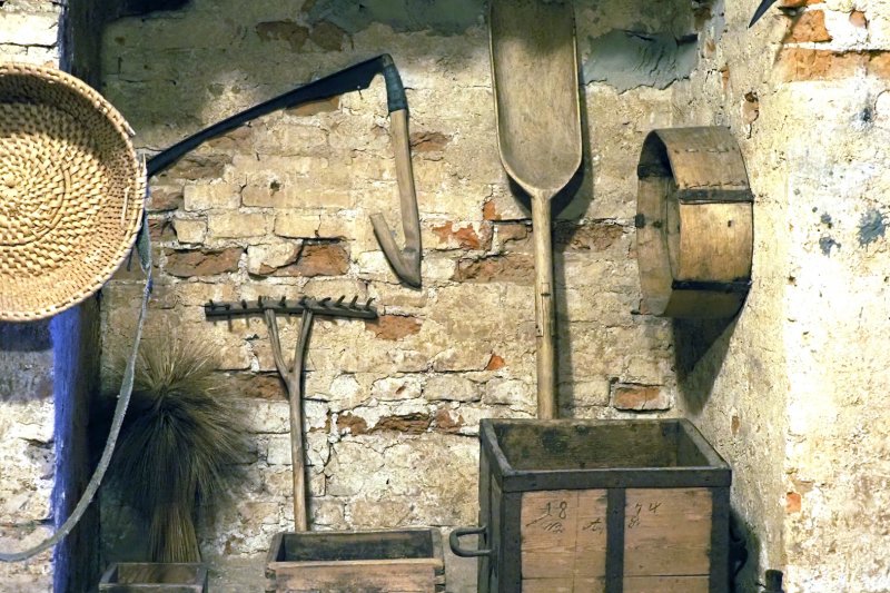 Čia yra ir ožys dalgiui plakti, spragilai, medinės trišakės, girnos, iš ežero nendrių pintos bamblės grūdams laikyti, maišas miežiams mirkyti, iki tie išbrinks.