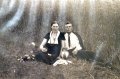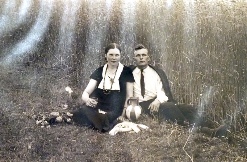 2. Ona Paliulionienė (Einorytė) su vyru Pranu Paliulioniu iš Kupreliškio apylinkių sėdi javų palaukėje su alaus ąsočiu apie 1939 m. Fotografavo Romas Paliulionis. Biržų muziejaus „Sėla“ nuotr.