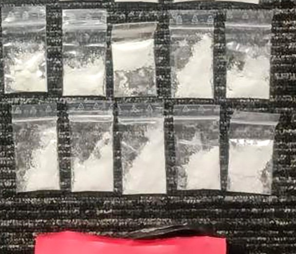 Ten pareigūnai rado 10 maišelių su baltais milteliais.