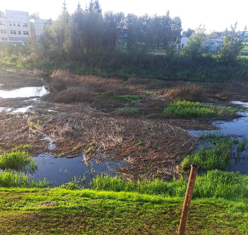 Upę valę darbininkai nupjovė dalį tankiai augančių meldų, bet jų neištraukė į krantą, o tiesiog paliko mirkti vandenyje.
