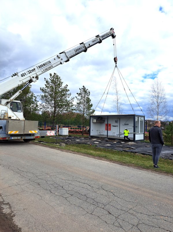 Pasisamdęs kraną R.Vieščiūnas praėjusią savaitę išgabeno savąją kavinę–barą nuo marių pakrantės. R.Vieščiūno nuotr.