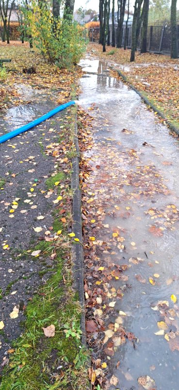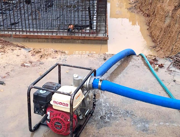 Savaitgalį pliaupiantis lietus pripildė statybvietės aikštelę ir duobes vandeniu. Vyrai ilgai nesuko galvos, atsitempė varikliuką ir ėmė pumpuoti vandenį paprasčiausiu būdu– išmetė žarną per tvorą – ir vandens fontanas pasipylė į Dainavos mikrorajoną.