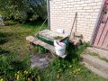 Ant lauke stovinčio suklypusio stalo guli suvytusių alyvų puokštė, ant suolo – kibiras su šiukšlių maišu. Išlindo ir šunelis.
