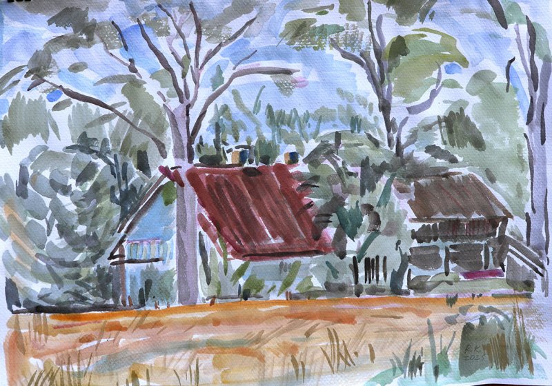 6. 7. Šį kartą plenero dalyvės tapė kaimo realybę, ką matė vaikščiodamos po apylinkes ir žvalgydamosi į bažnyčios šventorių bei į gyvenamus ir negyvenamus namus.