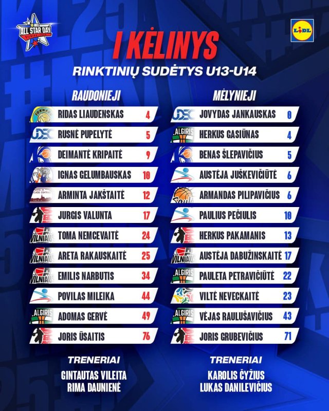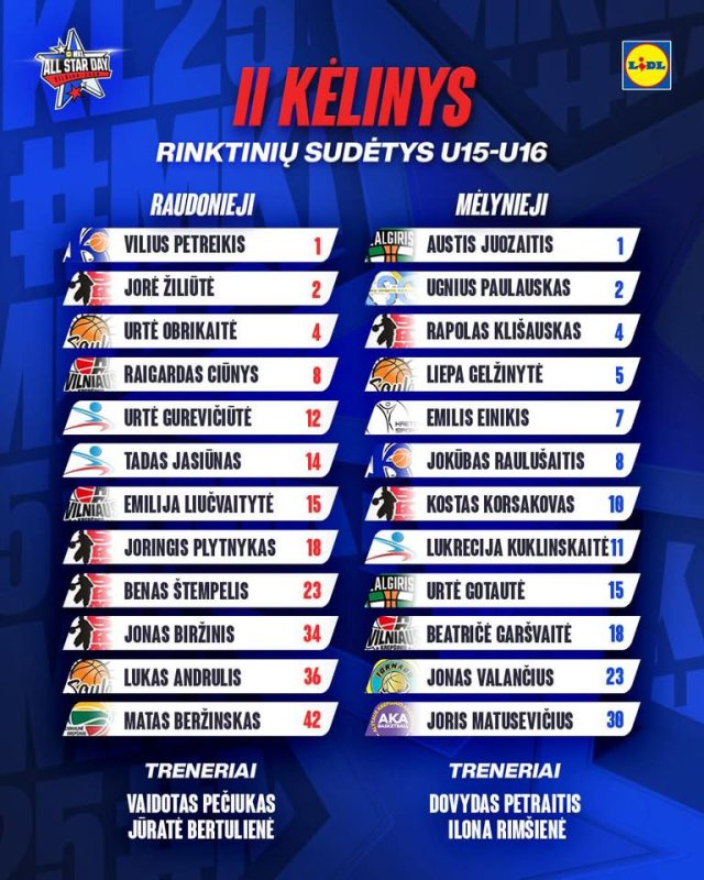 15–16 metų krepšininkų grupėje už „Raudonuosius“ kovos Urtė Gurevičiūtė ir Tadas Jasiūnas, o „Mėlynųjų“ komandoje žais Lukrecija Kuklinskaitė.