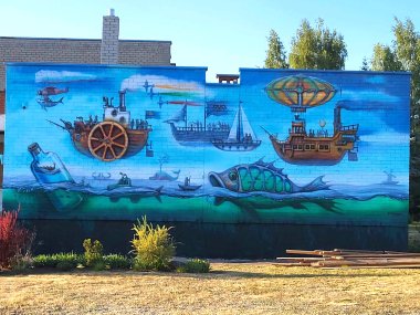 O paveikslas po atviru dangumi savo mėlynumu šviečia iš tolo. Važiuojant pagrindine Saločių gatve jo nepamatyti neįmanoma. Bet laivų tikrai yra. Įvairiausių.