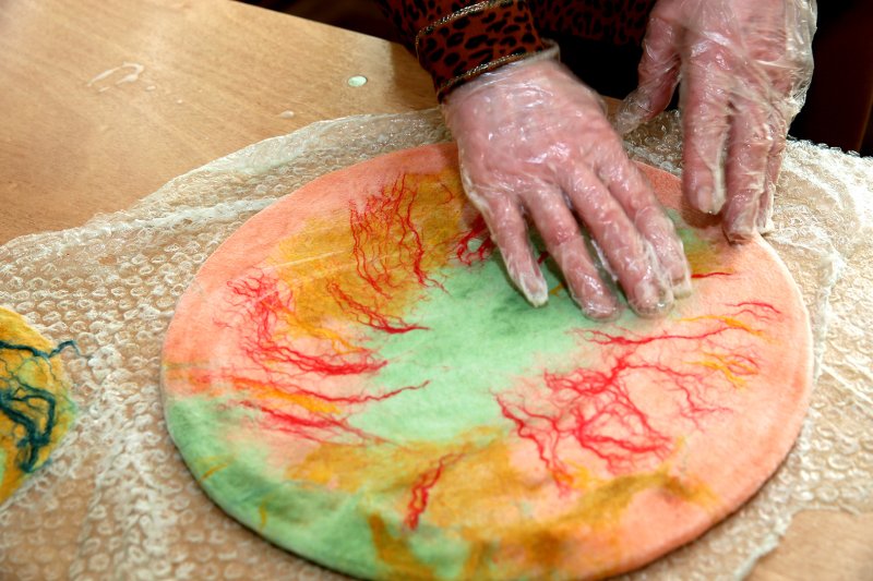 Pirmiausia pagrindui imamas putplasčio kiaušinis, ant jo klojami pluošteliai spalvotų vilnos sruogų, tada drėkinama karštu vandeniu ir muiluojama ūkiniu muilu.