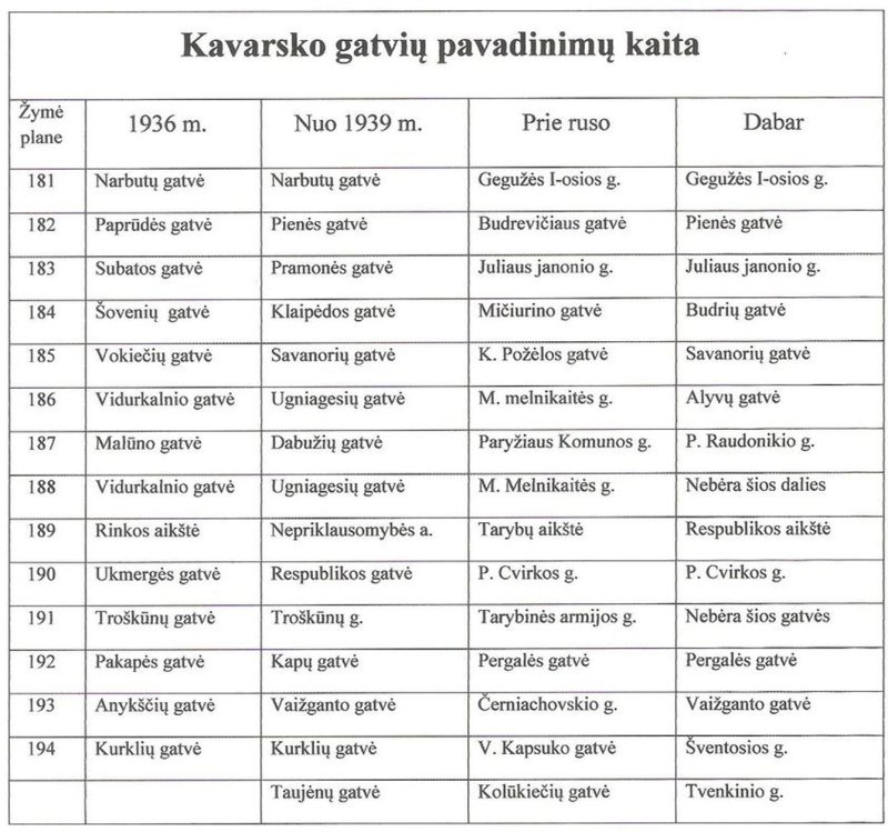 2. Kavarskiečio Rimanto Varanavičiaus surinkta ir susisteminta informacija rodo, kaip kito Kavarsko gatvių pavadinimai. Tai – tik dalis autoriaus išnagrinėtų gatvelių pavadinimų.