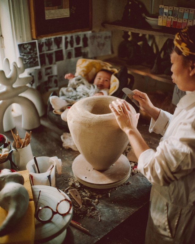 1. Galbūt baltieji vaisingumo indai tikrai veiksmingi, jei menininkė sugeba derinti pilną iššūkių motinystę ir kūrybą.