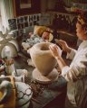 Iš lauko patenkame tiesiai į keramikės dirbtuvę. Didelę jos dalį užima stalas. Ant jo dar nebaigti kūriniai – baltutėliai savotiškų formų indai.