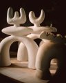 Vieni baltieji indai glotnūs, kiti gruoblėti, bet pagrindiniais kūnais panašūs, skiriasi tik puošybos elementais ir išsišovusiomis detalėmis. Pasak menininkės, tai –Džiomon – vaisingumo indai, kolekcija. Ją kuria įkvėpta tolimos praeities.