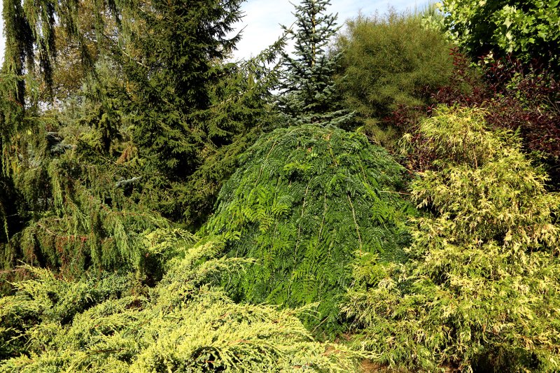 Juodalksnis, kurio lapai tarsi spygliai. Baltalksnis, margalapis skirpstas, kamštinis skirpstas, klevas, kuris ūgtelėjęs dėl ypatingų lapų atrodys visai baltas, krūminis smulkiažiedis kaštonas, žagrenio rūšis, vadinama geiša, veimutinė pušis ir begalė vis kitokių jos giminaičių, besiskiriančių spalva, spyglių ilgiu ir kankorėžių dydžiu.