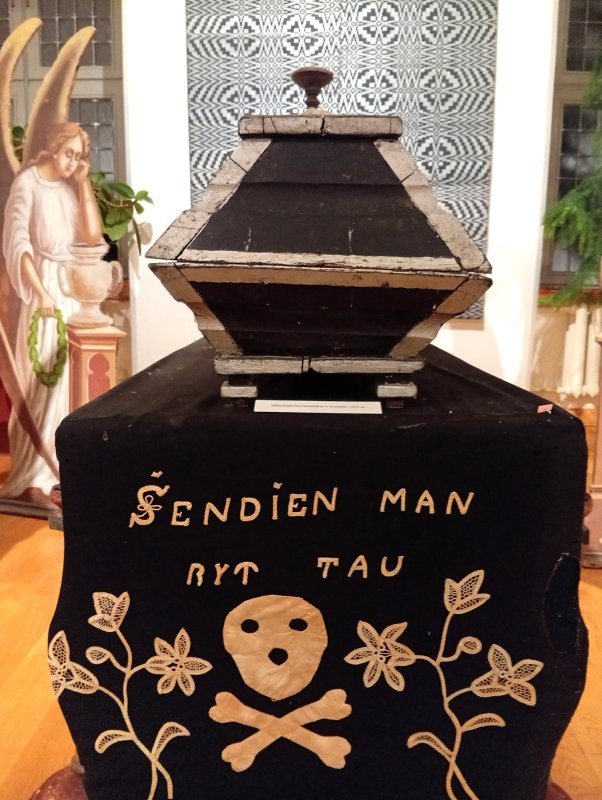 4. Katafalkas uždengtas juodu audeklu su išsiuvinėtu užrašu.