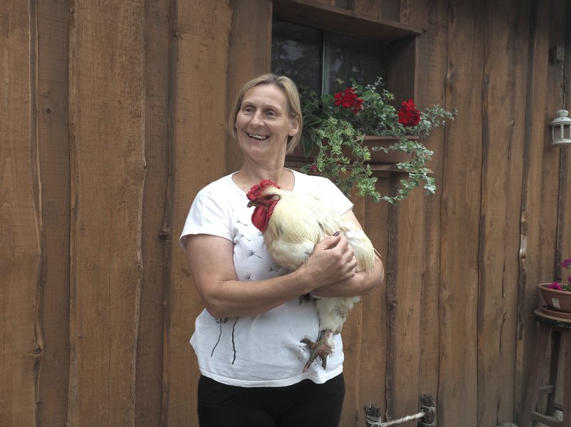 Aprodydama savo vištyną L.Bžeskienė glėbyje atsineša numylėtinį – baltą gaidį. Jį užsiaugino nuo viščiuko, tad paukštis, pašauktas Gaideliu, ima aplink šeimininkę rėžti sparną.