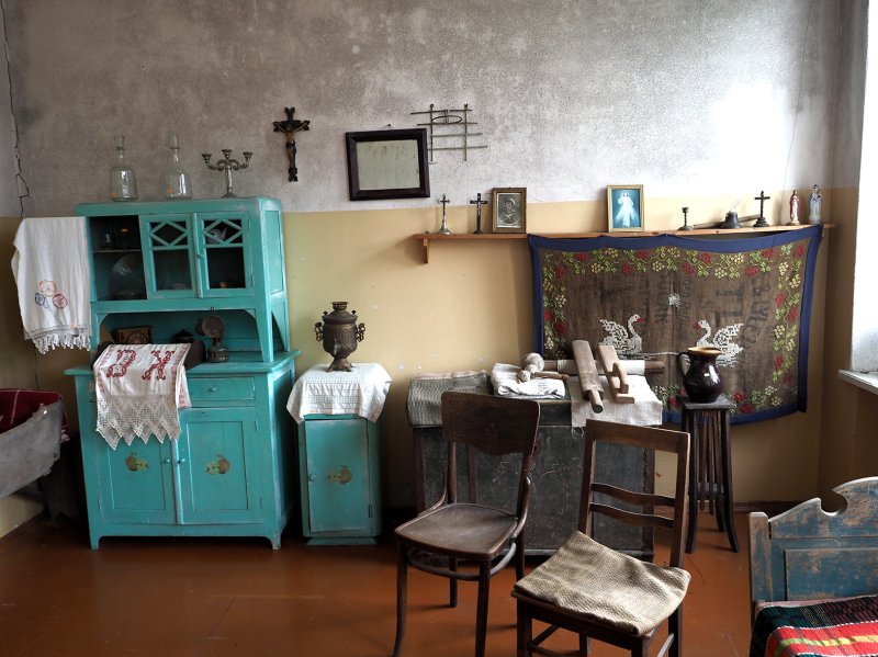 Savadarbiai mėtine spalva dažyti virtuvės baldai, lova su visais patalais, medinis lopšys, austinių rankšluosčių eilė, senos medicinos priemonės, verpimo ratelis, buities ir ūkio rakandai, tarpukario laikų spaudos leidiniai bei knygos ir daug kitokių įdomybių.