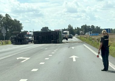 Antradienį popiet Pasvalio rajone, tarptautinėje magistralėje „Via Baltica“ ties Raubonių kaimu ir Biržų link vedančiu posūkiu, apvirto traktorius.
