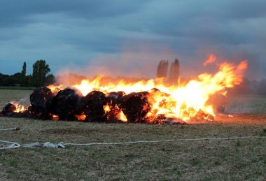 Bet gaisras plito ražienomis, ir vienas po kito ėmė liepsnoti 50 šiaudų ritinių. Ugnis šėlo maždaug 10 hektarų plote, padangė nusidažė juodais dūmais.