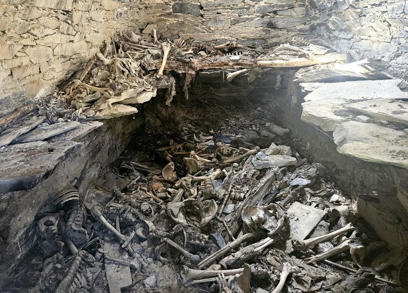 Nesimatė greta ir ūkinių pastatų, kaip įprasta šiuose kraštuose. Pažvelgę pro langelį viduje pamatėme krūvas žmogaus skeleto kaulų. Skeletų ten būta tikriausiai kelios dešimtys. Vieni ant kitų sukritę.