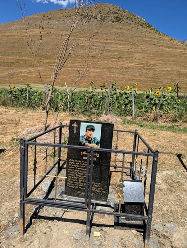 Prieiname, netrukus stovime prie kario kapo. Tai vietos kartvelas, žuvęs Ukrainoje kovose su rusofašistais. Nemažai kartvelų, kuriuos 2008 metais irgi buvo užpuolusi Rusija, atplėšė dalį teritorijos, dabar kariauja gindami Ukrainą. Tai štai kodėl čia saulėgrąžos žydi.