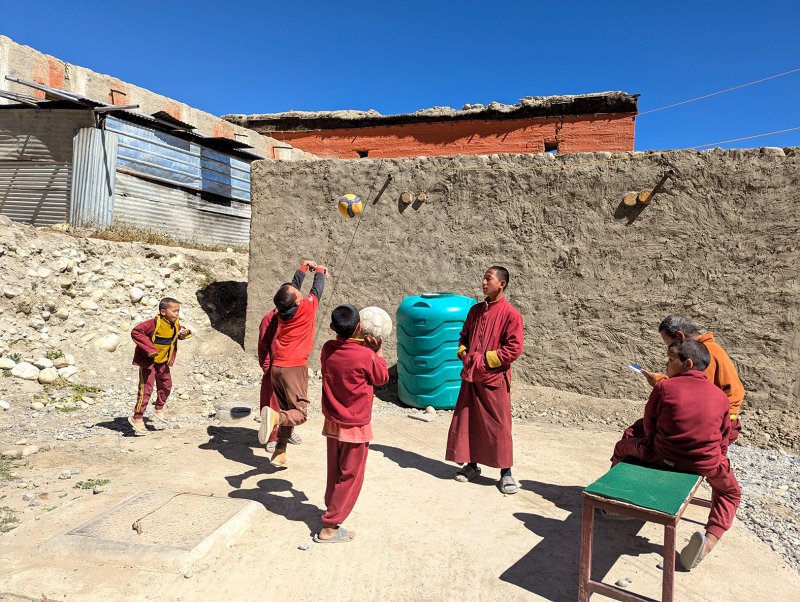 Šis Kagbeni kaimas mums pirmasis atšiaurioje kalnynų plyn-aukštėje, tad viskas įdomu. Čia jau laikomasi Tibeto tradicijų, nes jis, už netoliese esančios Kinijos sienos, visai netoli. Čia veikia ir garsus vienuolynas, o prie jo laksto vaikai, aprengti ilgais vienuolių drabužiais. Jie supranta, kad prieš svečius turi atrodyti rimti, bet vis tiek negali nesiausti per pertrauką tarp pamokų. Jie čia lanko mokyklą, tėvai juos atveža ilgam laikui, ne kiekvieną savaitgalį pasiima namo į dar nuošalesnius kaimus.