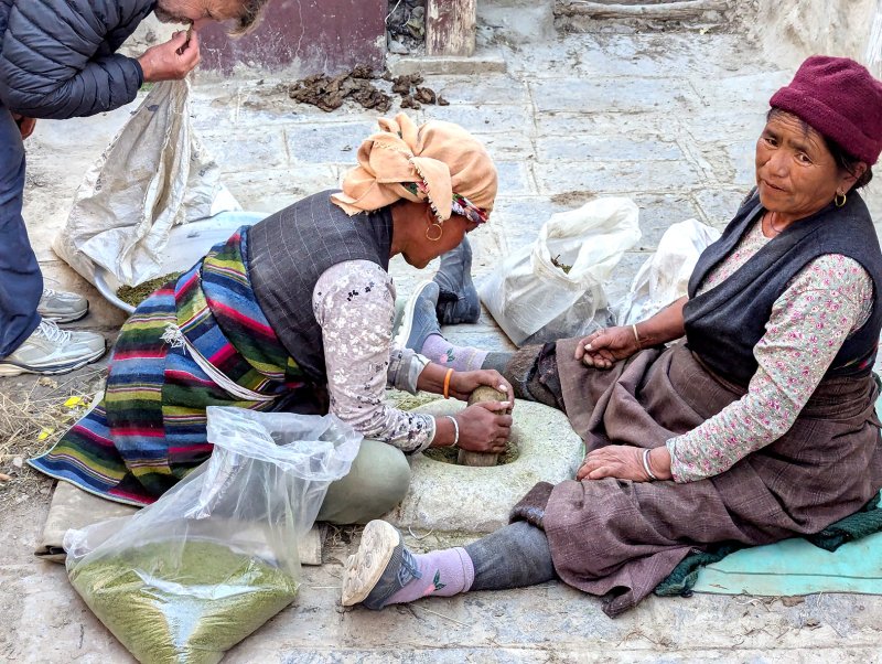 11. Šios moterys grūstuvu daužo žolę šventyklų smilkalams.