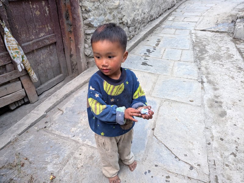 Žinojome, kad kelionėje sutiksime vaikų, tad atsivežėme saldainių. Daliname juos po nedaug – visi labai apsidžiaugia, nuoširdžiai dėkoja, bet matome, kad nors jie itin sočiu valgiu čia gal ir nelepinami, bet saldainių yra matę.